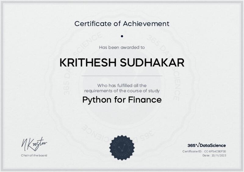 This user has been awarded the Python for Finance Certificate for successfully completing the course exam. Holding this certificate demonstrates their proficiency on the topic and signifies they are qualified to apply their newly acquired expertise in the fields of data analytics and data science.