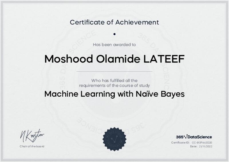 This user has been awarded the Machine Learning with Naïve Bayes Certificate for successfully completing the course exam. Holding this certificate demonstrates their proficiency on the topic and signifies they are qualified to apply their newly acquired expertise in the fields of data analytics and data science.