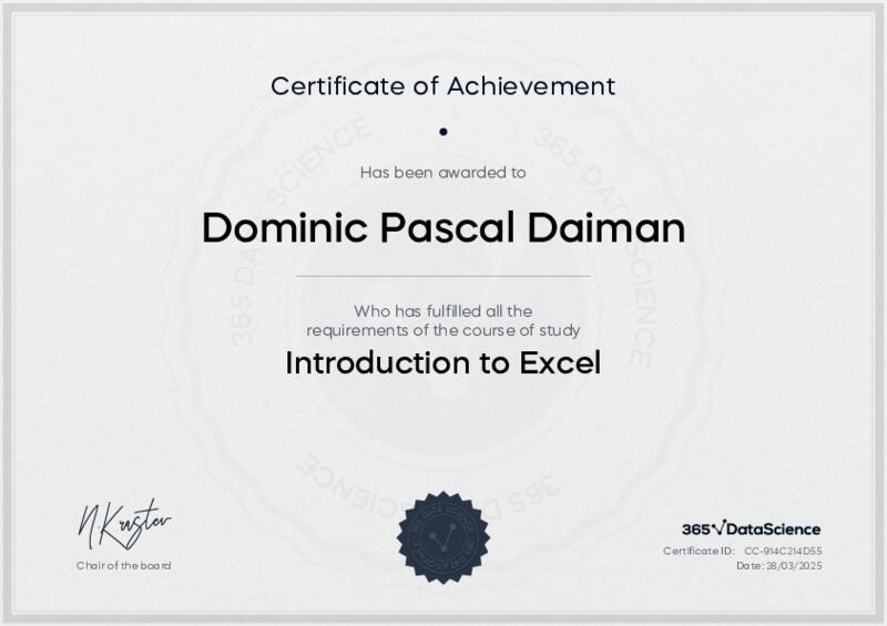This user has been awarded the Introduction to Excel Certificate for successfully completing the course exam. Holding this certificate demonstrates their proficiency on the topic and signifies they are qualified to apply their newly acquired expertise in the fields of data analytics and data science.
