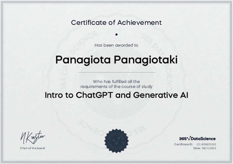 This user has been awarded the Intro to ChatGPT and Generative AI Certificate for successfully completing the course exam. Holding this certificate demonstrates their proficiency on the topic and signifies they are qualified to apply their newly acquired expertise in the fields of data analytics and data science.