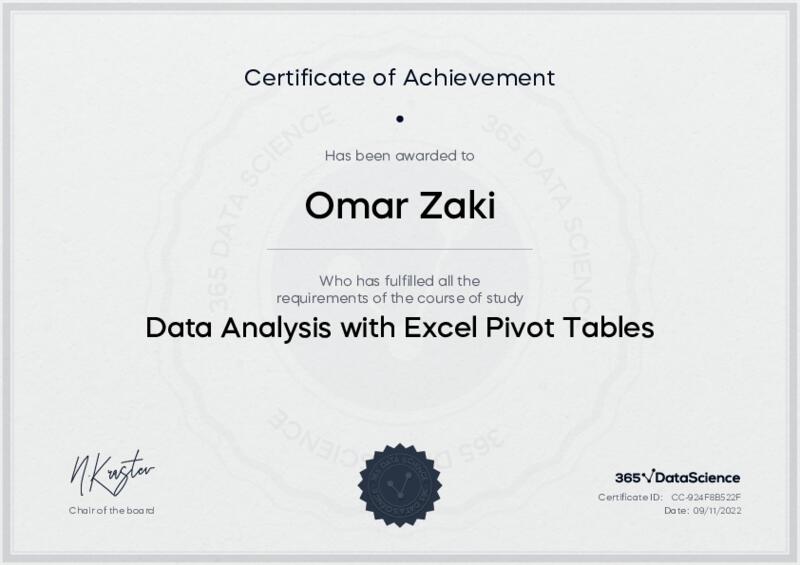 This user has been awarded the Data Analysis with Excel Pivot Tables Certificate for successfully completing the course exam. Holding this certificate demonstrates their proficiency on the topic and signifies they are qualified to apply their newly acquired expertise in the fields of data analytics and data science.