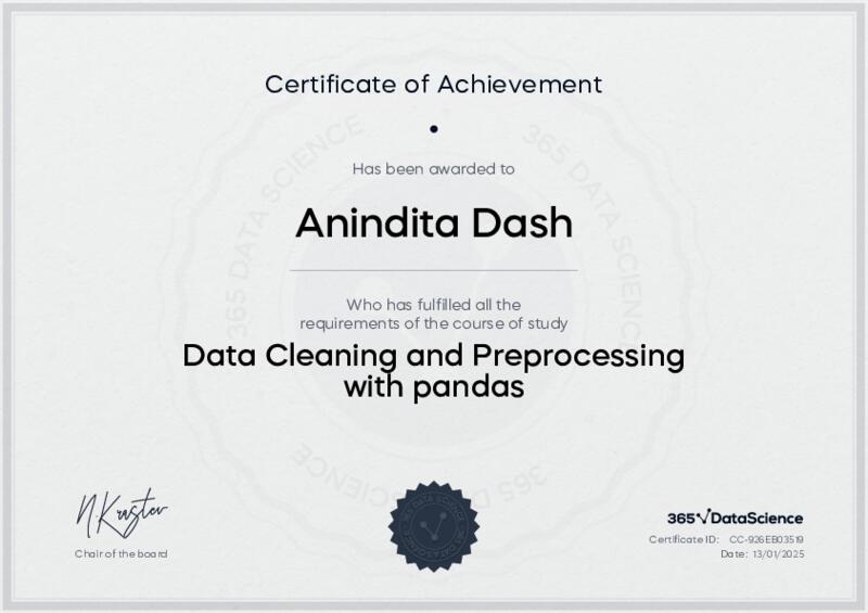 This user has been awarded the Data Cleaning and Preprocessing with pandas Certificate for successfully completing the course exam. Holding this certificate demonstrates their proficiency on the topic and signifies they are qualified to apply their newly acquired expertise in the fields of data analytics and data science.