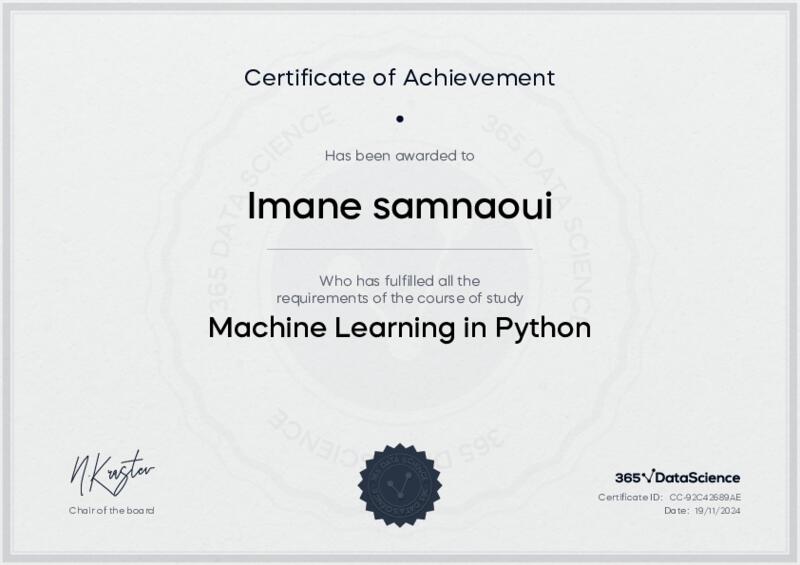 This user has been awarded the Machine Learning in Python Certificate for successfully completing the course exam. Holding this certificate demonstrates their proficiency on the topic and signifies they are qualified to apply their newly acquired expertise in the fields of data analytics and data science.