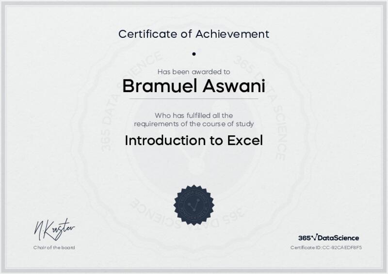 This user has been awarded the Introduction to Excel Certificate for successfully completing the course exam. Holding this certificate demonstrates their proficiency on the topic and signifies they are qualified to apply their newly acquired expertise in the fields of data analytics and data science.