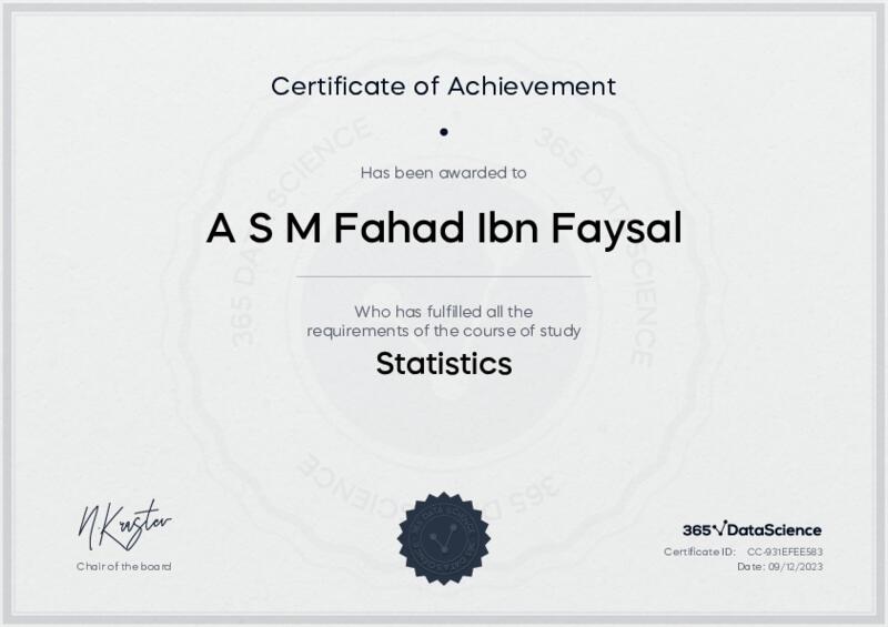 This user has been awarded the Statistics Certificate for successfully completing the course exam. Holding this certificate demonstrates their proficiency on the topic and signifies they are qualified to apply their newly acquired expertise in the fields of data analytics and data science.