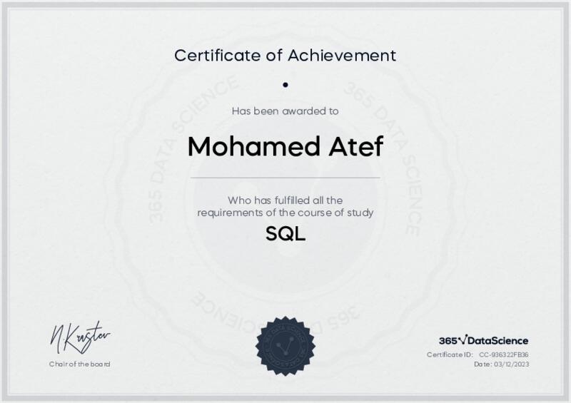 This user has been awarded the SQL Certificate for successfully completing the course exam. Holding this certificate demonstrates their proficiency on the topic and signifies they are qualified to apply their newly acquired expertise in the fields of data analytics and data science.