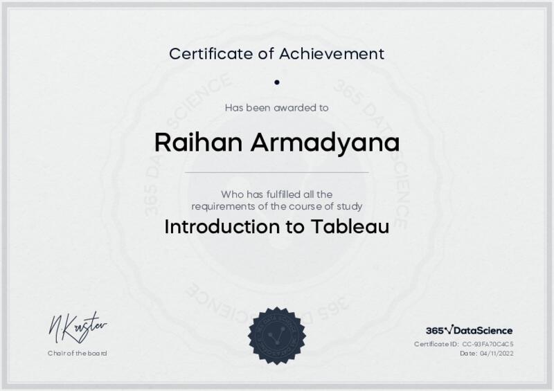 This user has been awarded the Introduction to Tableau Certificate for successfully completing the course exam. Holding this certificate demonstrates their proficiency on the topic and signifies they are qualified to apply their newly acquired expertise in the fields of data analytics and data science.