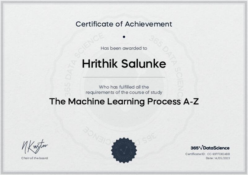 This user has been awarded the The Machine Learning Process A-Z Certificate for successfully completing the course exam. Holding this certificate demonstrates their proficiency on the topic and signifies they are qualified to apply their newly acquired expertise in the fields of data analytics and data science.