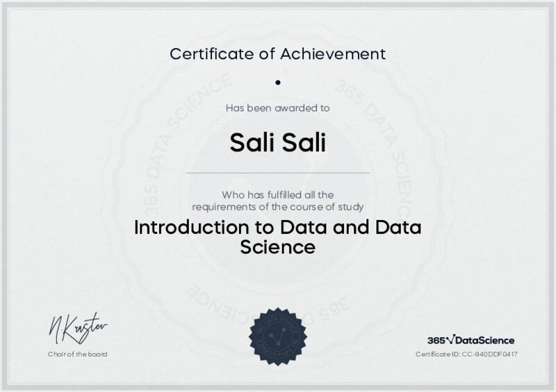 This user has been awarded the Introduction to Data and Data Science Certificate for successfully completing the course exam. Holding this certificate demonstrates their proficiency on the topic and signifies they are qualified to apply their newly acquired expertise in the fields of data analytics and data science.