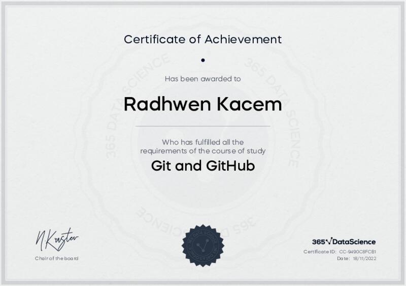This user has been awarded the Git and GitHub Certificate for successfully completing the course exam. Holding this certificate demonstrates their proficiency on the topic and signifies they are qualified to apply their newly acquired expertise in the fields of data analytics and data science.