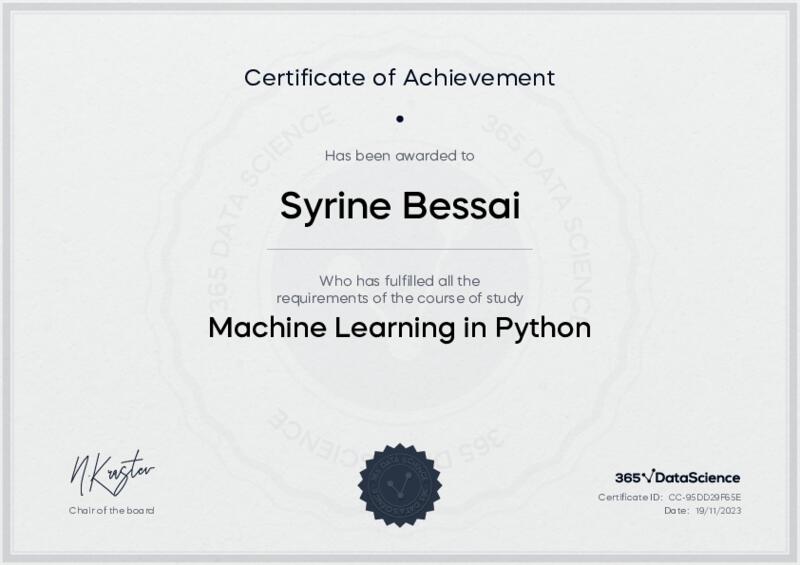 This user has been awarded the Machine Learning in Python Certificate for successfully completing the course exam. Holding this certificate demonstrates their proficiency on the topic and signifies they are qualified to apply their newly acquired expertise in the fields of data analytics and data science.