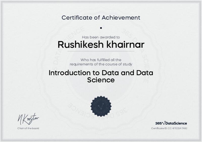 This user has been awarded the Introduction to Data and Data Science Certificate for successfully completing the course exam. Holding this certificate demonstrates their proficiency on the topic and signifies they are qualified to apply their newly acquired expertise in the fields of data analytics and data science.