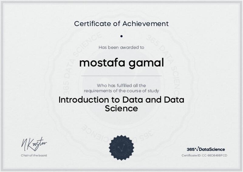 This user has been awarded the Introduction to Data and Data Science Certificate for successfully completing the course exam. Holding this certificate demonstrates their proficiency on the topic and signifies they are qualified to apply their newly acquired expertise in the fields of data analytics and data science.