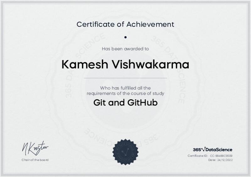 This user has been awarded the Git and GitHub Certificate for successfully completing the course exam. Holding this certificate demonstrates their proficiency on the topic and signifies they are qualified to apply their newly acquired expertise in the fields of data analytics and data science.