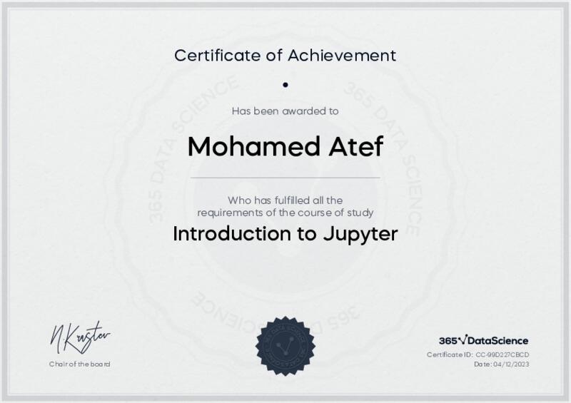 This user has been awarded the Introduction to Jupyter Certificate for successfully completing the course exam. Holding this certificate demonstrates their proficiency on the topic and signifies they are qualified to apply their newly acquired expertise in the fields of data analytics and data science.