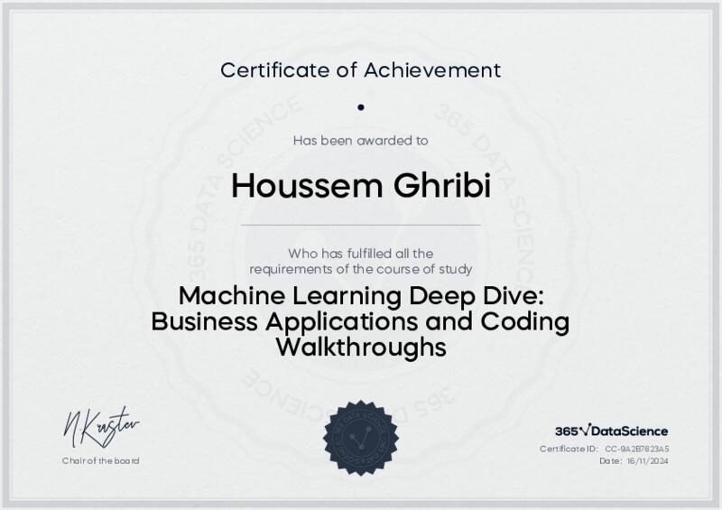 This user has been awarded the Machine Learning Deep Dive: Business Applications and Coding Walkthroughs Certificate for successfully completing the course exam. Holding this certificate demonstrates their proficiency on the topic and signifies they are qualified to apply their newly acquired expertise in the fields of data analytics and data science.