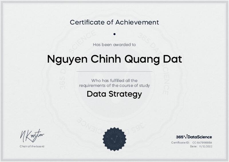 This user has been awarded the Data Strategy Certificate for successfully completing the course exam. Holding this certificate demonstrates their proficiency on the topic and signifies they are qualified to apply their newly acquired expertise in the fields of data analytics and data science.