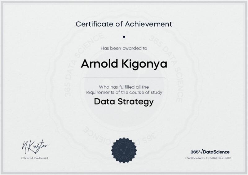 This user has been awarded the Data Strategy Certificate for successfully completing the course exam. Holding this certificate demonstrates their proficiency on the topic and signifies they are qualified to apply their newly acquired expertise in the fields of data analytics and data science.