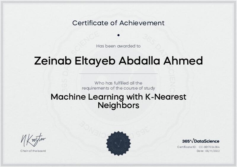 This user has been awarded the Machine Learning with K-Nearest Neighbors Certificate for successfully completing the course exam. Holding this certificate demonstrates their proficiency on the topic and signifies they are qualified to apply their newly acquired expertise in the fields of data analytics and data science.
