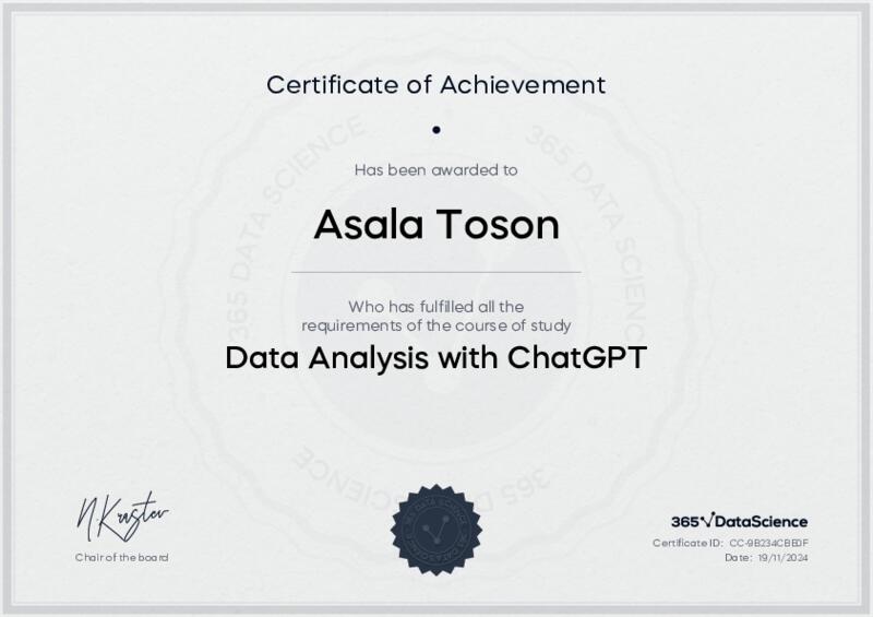 This user has been awarded the Data Analysis with ChatGPT Certificate for successfully completing the course exam. Holding this certificate demonstrates their proficiency on the topic and signifies they are qualified to apply their newly acquired expertise in the fields of data analytics and data science.