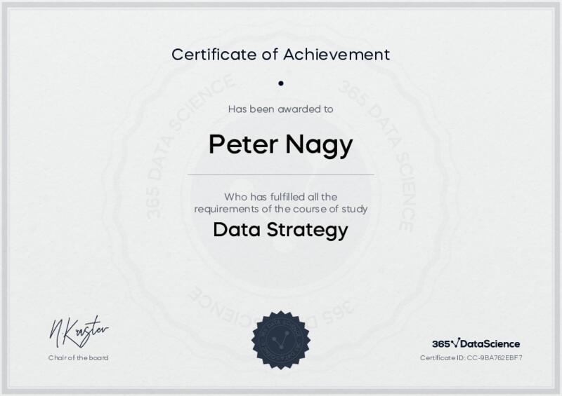 This user has been awarded the Data Strategy Certificate for successfully completing the course exam. Holding this certificate demonstrates their proficiency on the topic and signifies they are qualified to apply their newly acquired expertise in the fields of data analytics and data science.