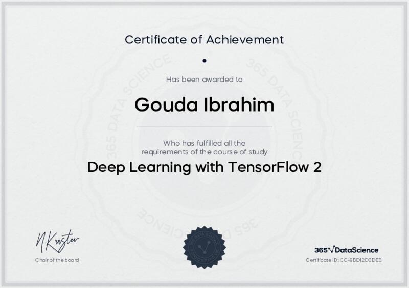 This user has been awarded the Deep Learning with TensorFlow 2 Certificate for successfully completing the course exam. Holding this certificate demonstrates their proficiency on the topic and signifies they are qualified to apply their newly acquired expertise in the fields of data analytics and data science.