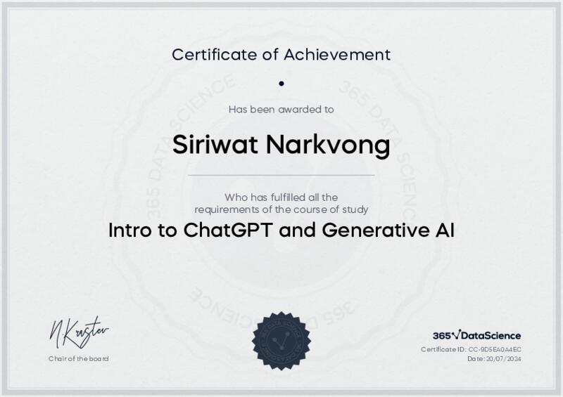 This user has been awarded the Intro to ChatGPT and Generative AI Certificate for successfully completing the course exam. Holding this certificate demonstrates their proficiency on the topic and signifies they are qualified to apply their newly acquired expertise in the fields of data analytics and data science.