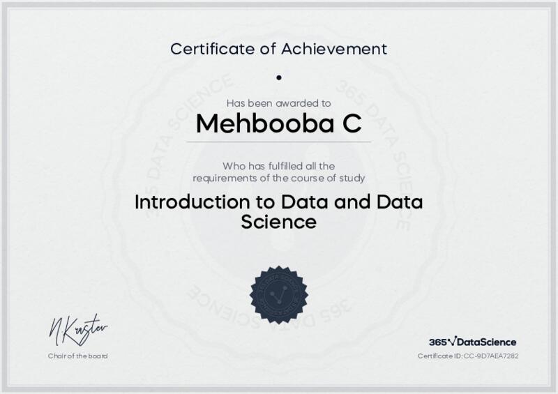This user has been awarded the Introduction to Data and Data Science Certificate for successfully completing the course exam. Holding this certificate demonstrates their proficiency on the topic and signifies they are qualified to apply their newly acquired expertise in the fields of data analytics and data science.