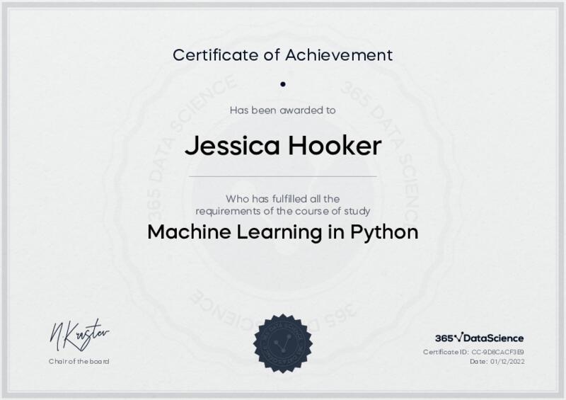 This user has been awarded the Machine Learning in Python Certificate for successfully completing the course exam. Holding this certificate demonstrates their proficiency on the topic and signifies they are qualified to apply their newly acquired expertise in the fields of data analytics and data science.