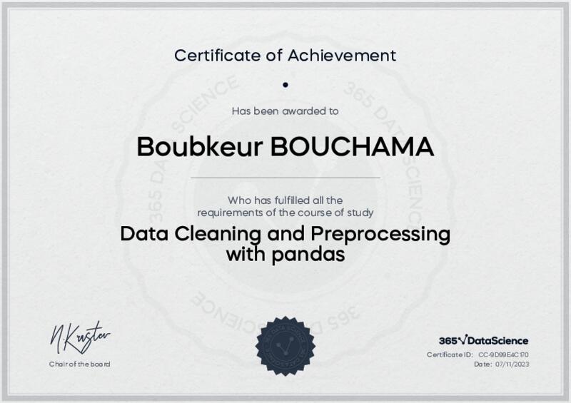 This user has been awarded the Data Cleaning and Preprocessing with pandas Certificate for successfully completing the course exam. Holding this certificate demonstrates their proficiency on the topic and signifies they are qualified to apply their newly acquired expertise in the fields of data analytics and data science.
