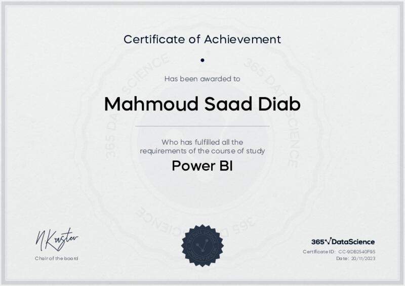 This user has been awarded the Power BI Certificate for successfully completing the course exam. Holding this certificate demonstrates their proficiency on the topic and signifies they are qualified to apply their newly acquired expertise in the fields of data analytics and data science.