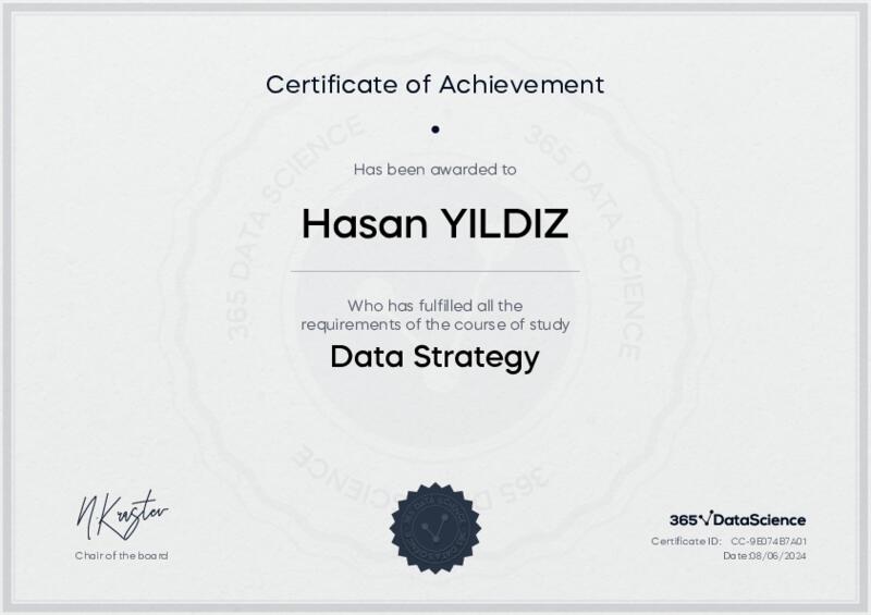 This user has been awarded the Data Strategy Certificate for successfully completing the course exam. Holding this certificate demonstrates their proficiency on the topic and signifies they are qualified to apply their newly acquired expertise in the fields of data analytics and data science.