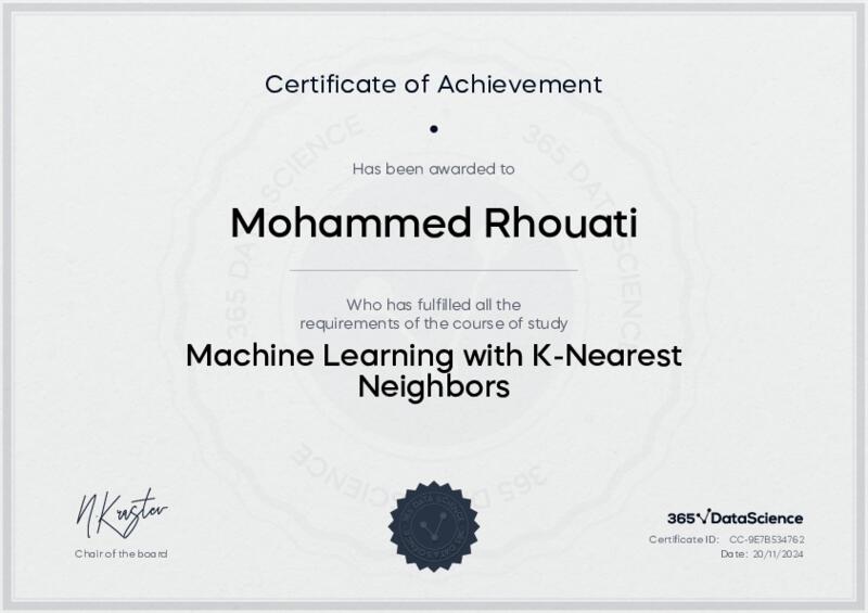 This user has been awarded the Machine Learning with K-Nearest Neighbors Certificate for successfully completing the course exam. Holding this certificate demonstrates their proficiency on the topic and signifies they are qualified to apply their newly acquired expertise in the fields of data analytics and data science.
