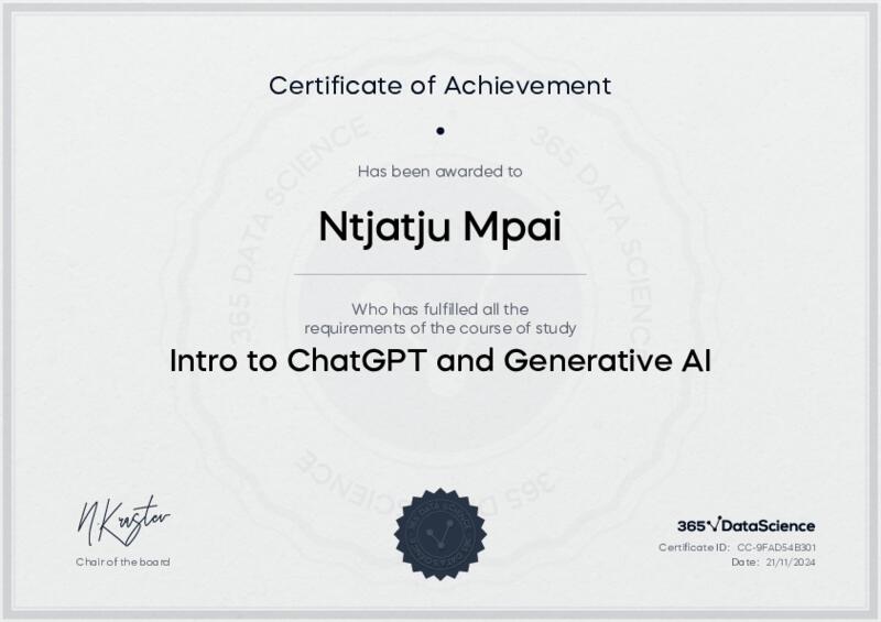 This user has been awarded the Intro to ChatGPT and Generative AI Certificate for successfully completing the course exam. Holding this certificate demonstrates their proficiency on the topic and signifies they are qualified to apply their newly acquired expertise in the fields of data analytics and data science.