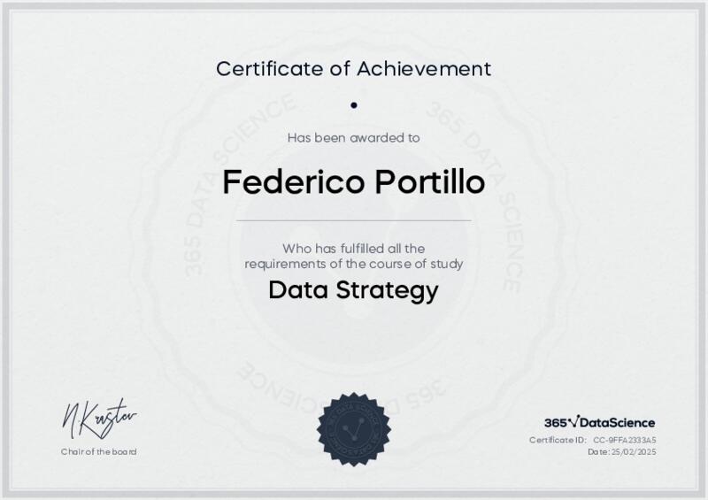 This user has been awarded the Data Strategy Certificate for successfully completing the course exam. Holding this certificate demonstrates their proficiency on the topic and signifies they are qualified to apply their newly acquired expertise in the fields of data analytics and data science.