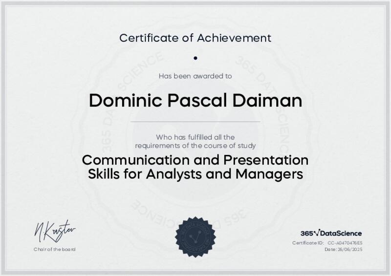 This user has been awarded the Communication and Presentation Skills for Analysts and Managers Certificate for successfully completing the course exam. Holding this certificate demonstrates their proficiency on the topic and signifies they are qualified to apply their newly acquired expertise in the fields of data analytics and data science.