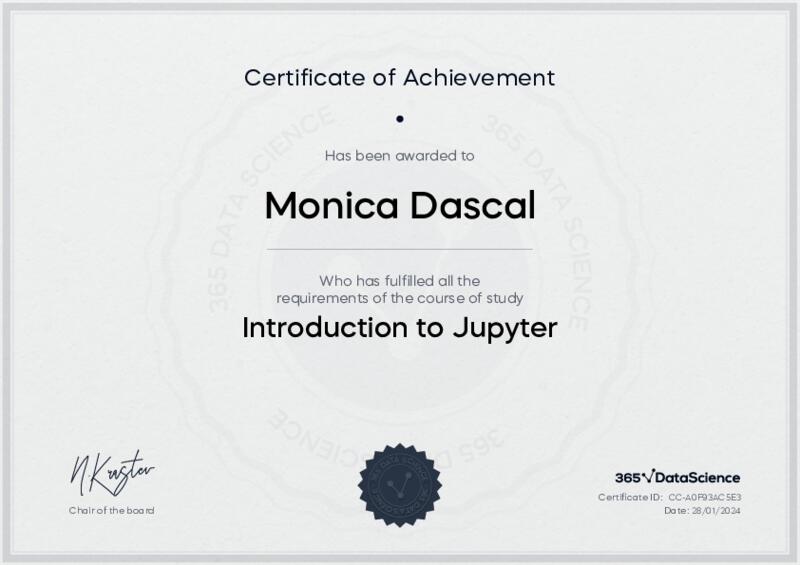 This user has been awarded the Introduction to Jupyter Certificate for successfully completing the course exam. Holding this certificate demonstrates their proficiency on the topic and signifies they are qualified to apply their newly acquired expertise in the fields of data analytics and data science.