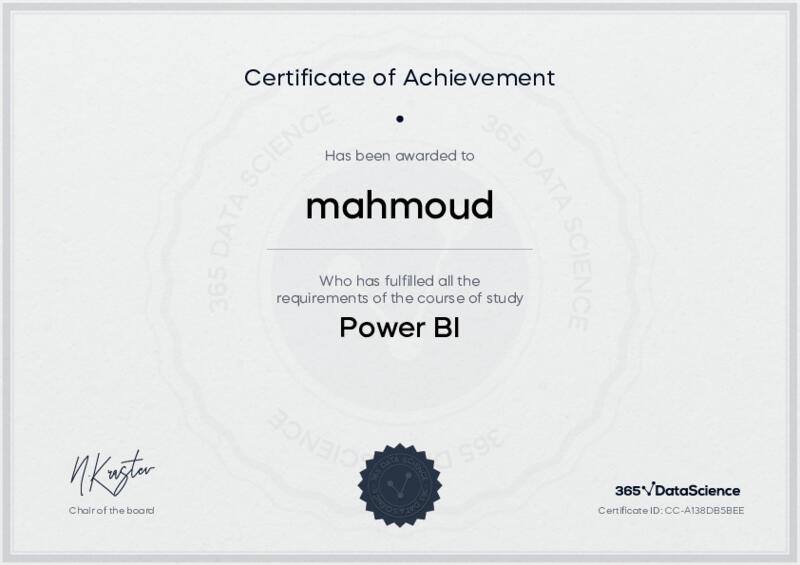 This user has been awarded the Power BI Certificate for successfully completing the course exam. Holding this certificate demonstrates their proficiency on the topic and signifies they are qualified to apply their newly acquired expertise in the fields of data analytics and data science.
