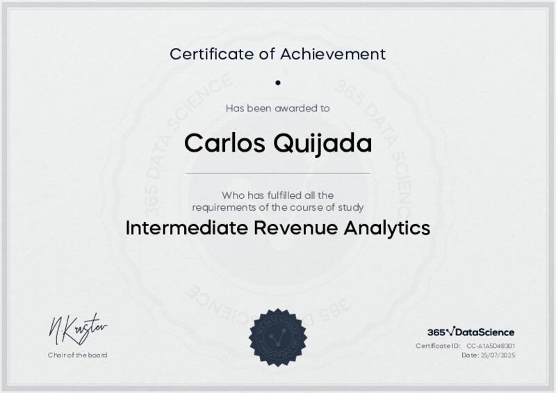 This user has been awarded the Intermediate Revenue Analytics Certificate for successfully completing the course exam. Holding this certificate demonstrates their proficiency on the topic and signifies they are qualified to apply their newly acquired expertise in the fields of data analytics and data science.