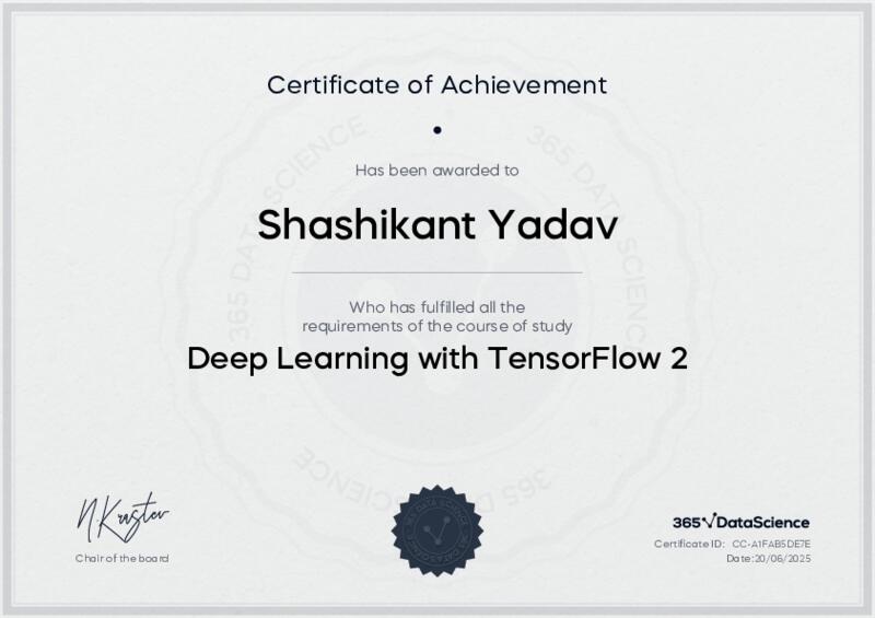 This user has been awarded the Deep Learning with TensorFlow 2 Certificate for successfully completing the course exam. Holding this certificate demonstrates their proficiency on the topic and signifies they are qualified to apply their newly acquired expertise in the fields of data analytics and data science.