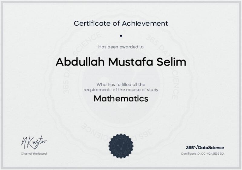This user has been awarded the Mathematics Certificate for successfully completing the course exam. Holding this certificate demonstrates their proficiency on the topic and signifies they are qualified to apply their newly acquired expertise in the fields of data analytics and data science.