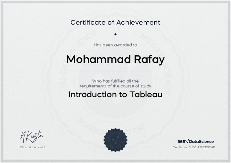 This user has been awarded the Introduction to Tableau Certificate for successfully completing the course exam. Holding this certificate demonstrates their proficiency on the topic and signifies they are qualified to apply their newly acquired expertise in the fields of data analytics and data science.