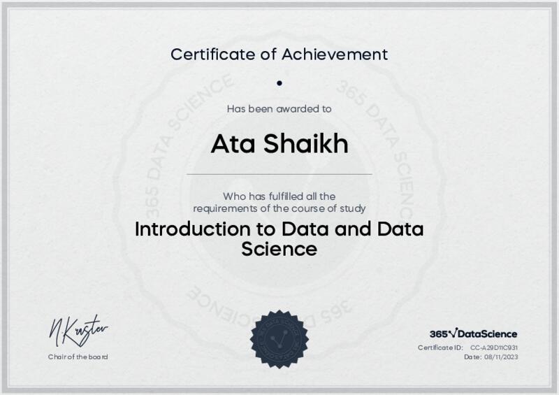 This user has been awarded the Introduction to Data and Data Science Certificate for successfully completing the course exam. Holding this certificate demonstrates their proficiency on the topic and signifies they are qualified to apply their newly acquired expertise in the fields of data analytics and data science.