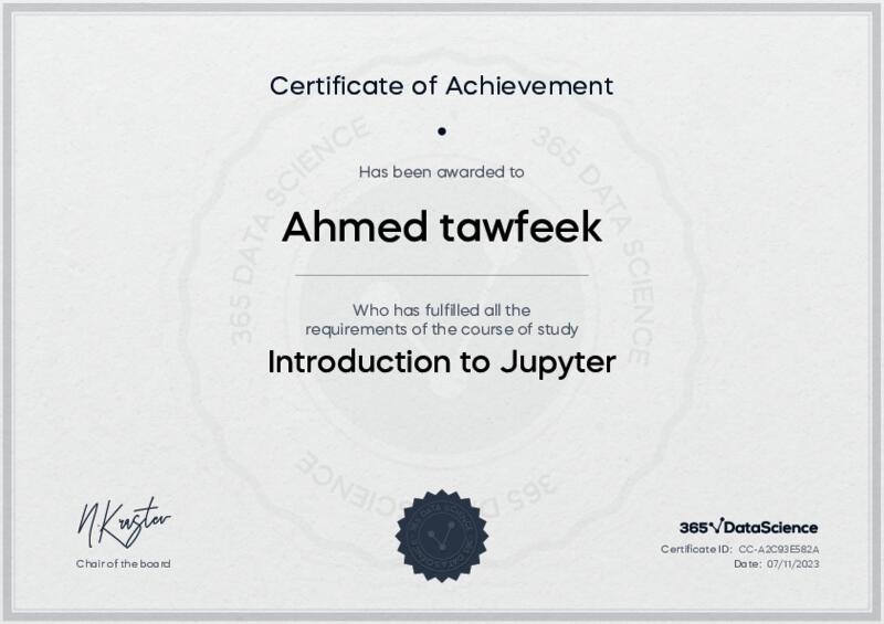 This user has been awarded the Introduction to Jupyter Certificate for successfully completing the course exam. Holding this certificate demonstrates their proficiency on the topic and signifies they are qualified to apply their newly acquired expertise in the fields of data analytics and data science.