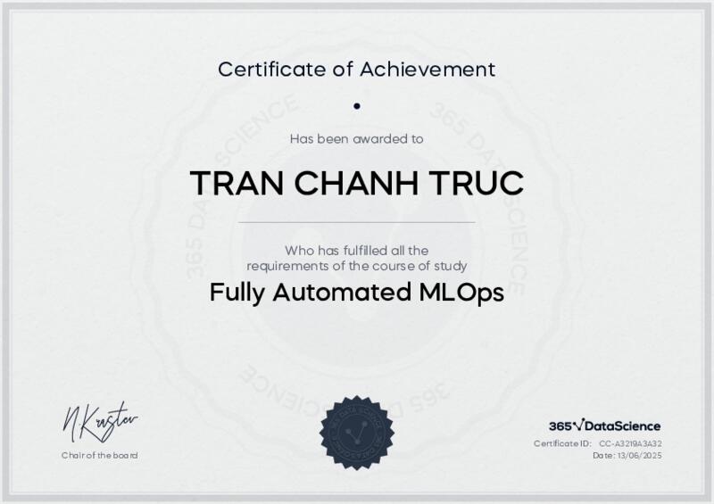 This user has been awarded the Fully Automated MLOps Certificate for successfully completing the course exam. Holding this certificate demonstrates their proficiency on the topic and signifies they are qualified to apply their newly acquired expertise in the fields of data analytics and data science.