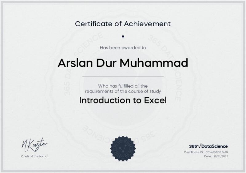 This user has been awarded the Introduction to Excel Certificate for successfully completing the course exam. Holding this certificate demonstrates their proficiency on the topic and signifies they are qualified to apply their newly acquired expertise in the fields of data analytics and data science.