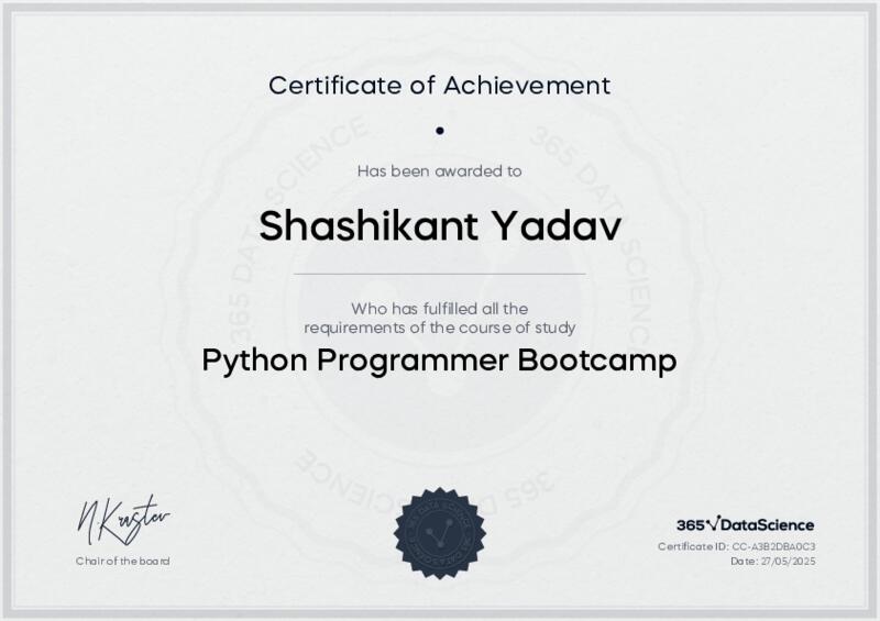 This user has been awarded the Python Programmer Bootcamp Certificate for successfully completing the course exam. Holding this certificate demonstrates their proficiency on the topic and signifies they are qualified to apply their newly acquired expertise in the fields of data analytics and data science.