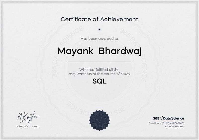 This user has been awarded the SQL Certificate for successfully completing the course exam. Holding this certificate demonstrates their proficiency on the topic and signifies they are qualified to apply their newly acquired expertise in the fields of data analytics and data science.