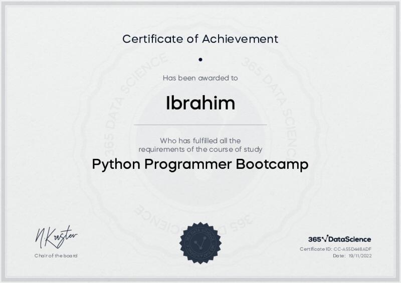 This user has been awarded the Python Programmer Bootcamp Certificate for successfully completing the course exam. Holding this certificate demonstrates their proficiency on the topic and signifies they are qualified to apply their newly acquired expertise in the fields of data analytics and data science.