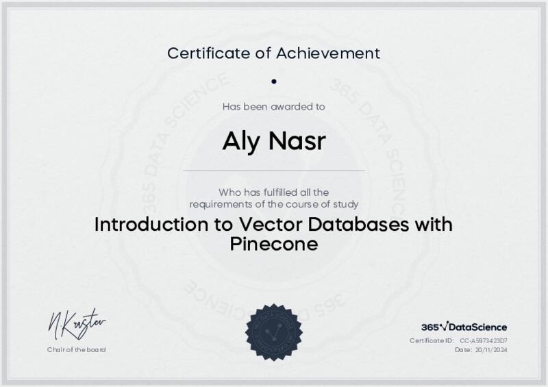 This user has been awarded the Introduction to Vector Databases with Pinecone Certificate for successfully completing the course exam. Holding this certificate demonstrates their proficiency on the topic and signifies they are qualified to apply their newly acquired expertise in the fields of data analytics and data science.